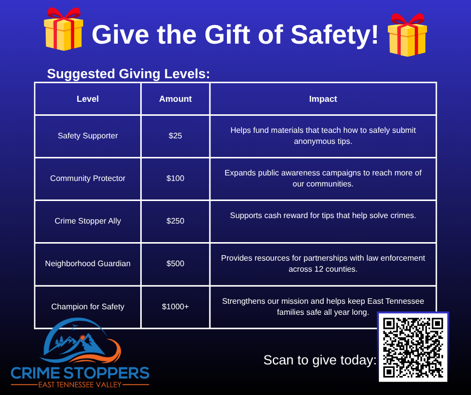 As the year comes to a close, East Tennessee Valley Crime Stoppers is asking for your support to continue the work that keeps our communities safe. Every day, we partner with local law enforcement and the public to help solve crimes, locate wanted fugitives, and give people a safe, anonymous way to speak up.